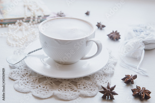 cup, tea, hot drink, drink, white, beverage, breakfast, food, hot, cafes, christmas, mug, milk, saucer, table, spoon, morning, closeup, flower, aroma, sweet, porcelain, plate, espresso, nobody, memory