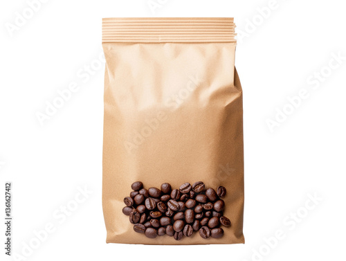 Coffee beans in a brown kraft paper bag ready for brewing on a transparent background, cut out