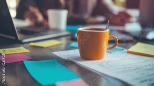 Coffee Break at Work: Productive Workspace with Laptop and Sticky Notes