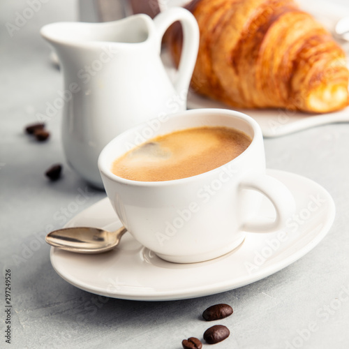 Coffee espresso in white cup with milk, jam and croissants.