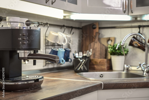 breakfast, clean, hot drink, coffee machine, coffeemaker, cup, day, decoration, domestic, elegance, flowerpot, furnishing, home, house, indoor, kitchen, kitchen sink, luxury, modern, morning, mug, nobody, provence, residence, residential, sink, utensil, vintage, worktop