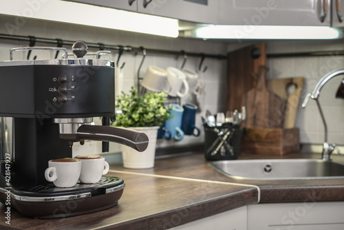 breakfast, clean, hot drink, coffee machine, coffeemaker, cup, day, decoration, domestic, elegance, flowerpot, furnishing, home, house, indoor, kitchen, kitchen sink, luxury, modern, morning, mug, nobody, provence, residence, residential, sink, utensil, vintage, worktop
