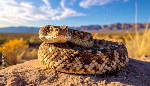 Coiled Rattlesnake in Desert Habitat - A Close-Up View of Venomous Reptile.