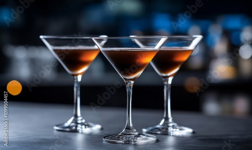 Cold Brew Martinis at the bar, close up; vibrant blues and rich caramel hues highlighted