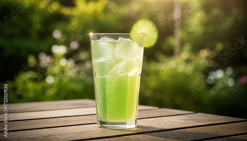 Cold Refreshing Green Cucumber Drink with Ice Cubes and Cucumber Slice Garnish on Wooden Table Outdoors in Summer Sunlight
