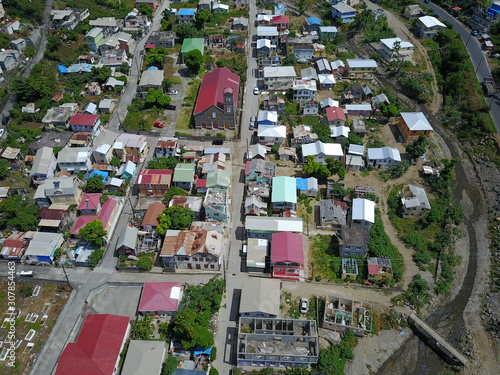 dominica, town, aerial, coast, coastline, coastal, seacoast, caribbean, summer, holiday, no people, landscape, island, travel, bay, wave, vacation, beautiful, tropical, sunshine, panorama, panoramic, scenic, island, village, house, waterfront, street, city planning, precinct, corrugated iron, vale, settlement