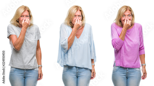 Collage of beautiful middle age blonde woman over white isolated backgroud smelling something stinky and disgusting, intolerable smell, holding breath with fingers on nose. Bad smells concept.