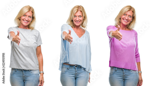Collage of beautiful middle age blonde woman over white isolated backgroud smiling friendly offering handshake as greeting and welcoming. Successful business.