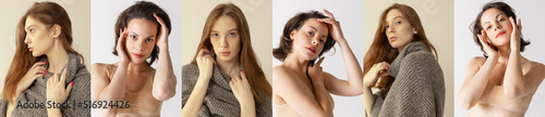 Collage. Portraits of young beautiful different women posing isolated over gray background. Concept of beauty, body and skin care, health, fashion, ad
