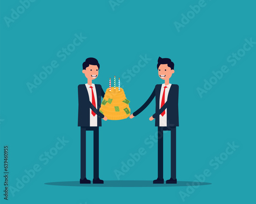 Colleague party celebration birthday. Business money cake. Vector illustration in cartoon style design