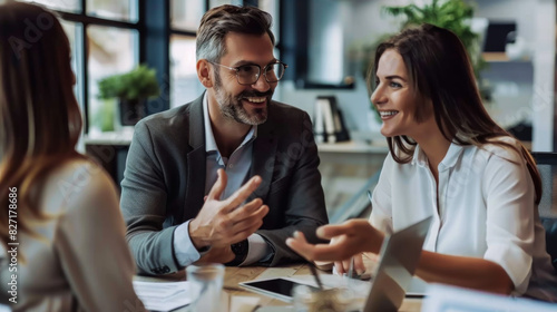 Colleagues in the office are talking in a meeting room, at a meeting. A group of employees work indoors together. Teamwork concept.