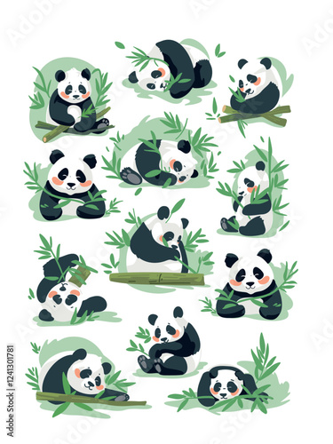 collection of adorable pandas and bamboo, vector graphics
