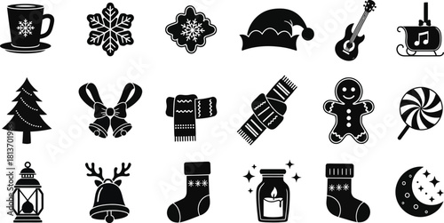 christmas, winter, holiday, symbol, set, graphic, design, decoration, ornament, snowman, tree, snowflake, bell, gift, star, hat, sock, gingerbread, man, candy, cane, music, guitar, sleigh, reindeer, antler, lantern, candle, light, moon, night, foulard, mitten, cup, mug, beverage, sweet, lollipop, celebration, season, festive, element, shape, outline, monochrome