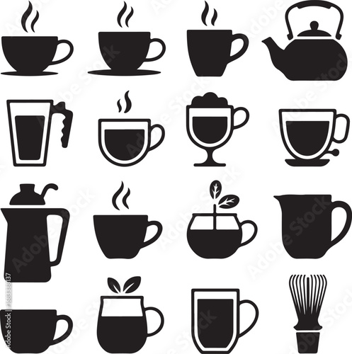 Collection of black beverage and drink icons on white background coffee cup tea cup