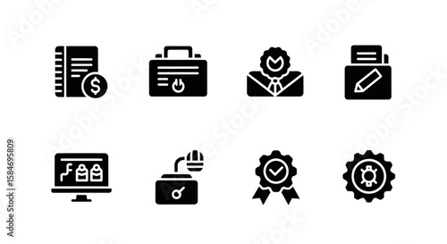icon, business, finance, money, dollar, notebook, briefcase, power, startup, success, achievement, award, checkmark, gear, setting, computer, monitor, graph, datum, analysis, document, crayons, write, edit, design, office, work, concept, symbol, signs, illustration, graphic, element, set, collection, black, white, isolated, modern, simple, flat, style, web, app, interface
