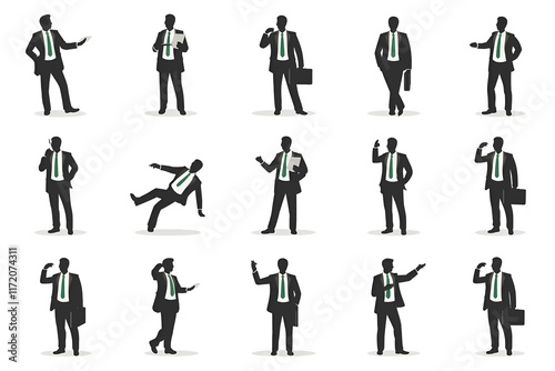 collection of black-and-white icons of businesspeople in professional attire, illustrating office culture, career growth, leadership, and workplace interaction.