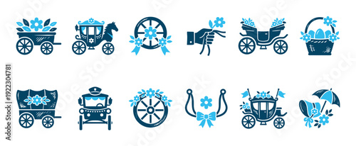 Collection of blue wedding and spring icons featuring horse-drawn carriages, flowers, baskets, and festive elements for celebration design in a charming silhouette style