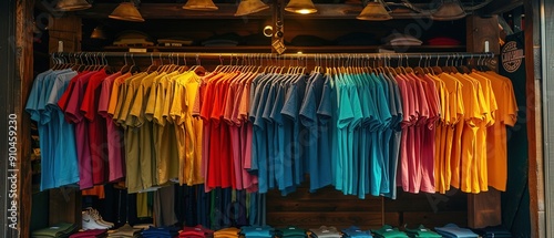 Collection of colorful t-shirts on a clothes rack for sale in store