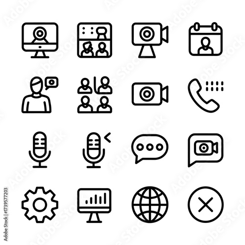 icon, communication, microphone, setting, virtual, collaboration, digital, technology, webcam, camera, calendar, user, phone, speech bubble, earth, cancel, conference, seminar, presentation, meeting, graphic, symbol, pictogram