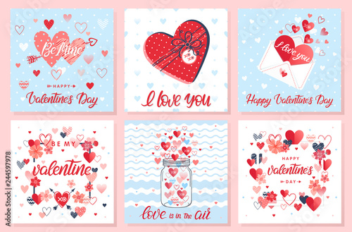 Collection of creative Valentines Day cards.Hand drawn lettering with hearts,arrows,maison jar,love letter and flowers.Romantic illustrations perfect for prints,flyers,posters,holiday invitations.