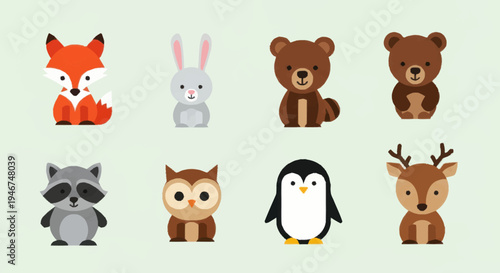 fox, rabbit, raccoon, owl, penguin, cervid, bear, animal, cute, cartoon, illustration, vector, wildlife, forest, nature, baby, children, drawing, graphic, design, character, icon, set, collection, group, adorable, sweet, friendly, playful, happy, joyful, cheerful, whimsical, stylised, flat, simple, minimalist, modern, art, digital, creature, mammal, bird, arctic, timberland