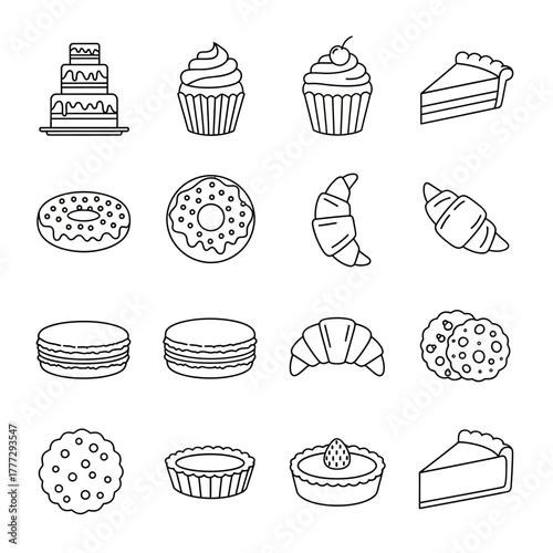pastry, bakery, cake, cupcake, donut, croissant, cookie, tart, pie, slice, dessert, sweet, food, baked, good, line, art, icon, illustration, outline, black, white, design, graphic, collection, set, delicious, treat, sugar, confectionery, epicure, breakfast, snack, flour, oven, baking, receipe, cream, frosting, sprinkle, cherry, chocolate, vanilla, simple, minimalist