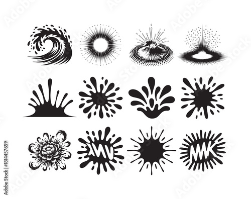 splash, wave, liquid, dripped, splatter, black, icon, set, abstract, shape, illustration, fluid, motion, dynamic, ink, stain, paint, design, element, symbol, graphic, isolated, white background, silhouette, vector, ripple, explosion, burst, flower, floral, bloom, blossom, decorative, natural, organic, energy, effect, movement, power, wet, spray, impact, radial