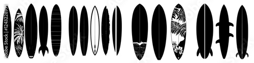 Collection of diverse surfboard silhouettes showcasing tropical themes and designs along a uniform background