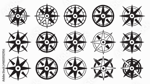 Collection of fifteen black and white compass rose illustrations on a white background