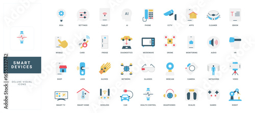 smart, device, technology, flat, icon, automation, ai, digital, innovation, connectivity, mobile, tablet, phone, cctv, cleaner, refrigerator, diagnostic, microwave, drone, monitoring, audio, shop, card, glove, network, goggles, webcam, camera, video, home, wireless, car, health, control, earphones, scale, game, robot, isolated, modern, vector, illustration