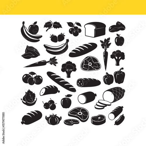Collection of Food Icons Fruits, Vegetables, Bread, and Meat Silhouettes