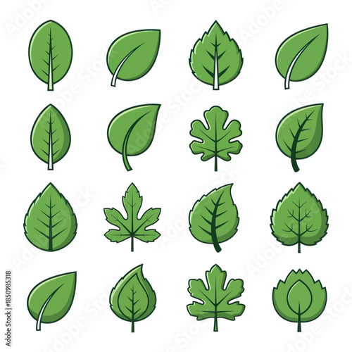 Collection of Green Leaf Illustrations with Detailed Veins and Outlines.