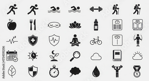 health, fitness, wellness, icon, symbol, illustration, drawing, vignetting, hand-drawn, line art, vector, set, collection, running, swimming, weightlift, gym, apple, health food, nourishment, sleep, meditation, yoga, water bottle, scale, weight loss, strength, balance, cardio, bike, bicycle, calendar, time, health care, medicals, shield, magnifying glass, search, growth, plant, cloud, book, stopwatch, nubes, dripped, award, medal