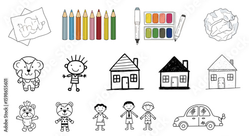 Collection of hand drawn sketches featuring animals people houses art supplies and crumpled paper on white background