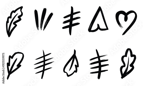 Collection of Hand-Drawn Brush Stroke Leaves, Tally Marks, Triangle, and Heart