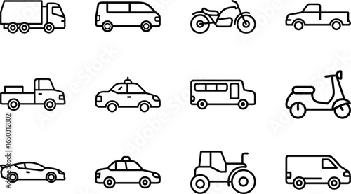 Collection of Minimal Line Icons Representing Various Vehicles Including Cars, Trucks, Buses, Motorcycles, Bicycles, Construction Equipment, and Emergency Vehicle