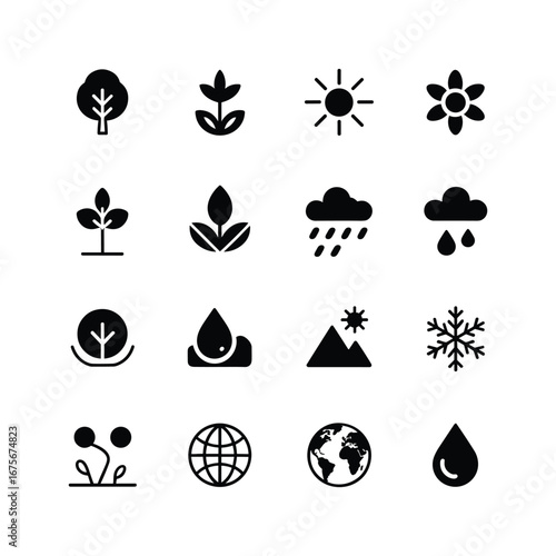 nature, weather, icon, set, growth, plant, leaf, tree, sun, flower, cloud, rain, water, dripped, mountain, snowflake, earth, globe, climate, season, spring, summer, autumn, winter, environment, ecology, symbol, design, graphic, collection