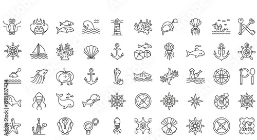 nautical, sea, ocean, marin, icon, line art, fish, whale, dolphin, lighthouse, coral, turtle, jellyfish, anchor, ship, boat, sailboat, shell, seahorse, crab, starfish, compass, steering wheel, map, tool, squid, seal, wave, lobster, seaweed, treasure, pirate, navigation, marine life, marine animal, ocean life, outline, drawing, illustration, symbol, signs, vector, graphic, design, icon