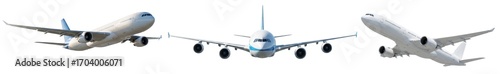 Collection of passenger airplanes, in a dynamic flight pose, isolated on a white background or transparent