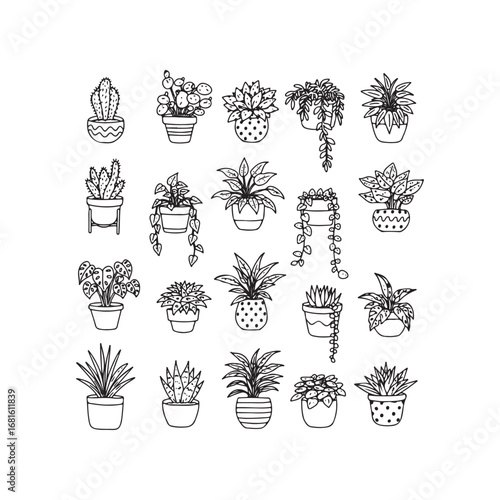 Collection of potted houseplants in a doodle art style isolated on white background
