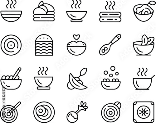 food, drink, icon, set, collection, drawing, vignetting, illustration, hand-drawn, outline, simple, minimalist, black-and-white, cooking, kitchen, eatery, cafes, menu, appetence, cookery, meal, dish, soup, bowl, steaming, fruit, vegetable, spoon, mortar, pestle, pan, plate, gastronomy, eating, refreshment, beverage, dessert, snack, organic, healthy, nourishment, ingredient