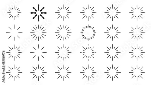 Collection of starburst icons in various styles and sizes in black and white for graphic design