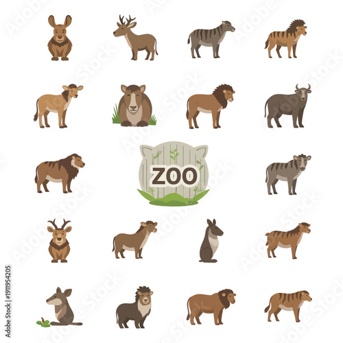 Collection of various cartoon wild animals and zoo sign.