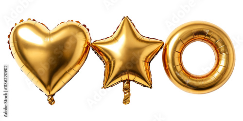 Collection of various golden balloons isolated on transparent background.