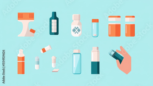 Collection of various medical and healthcare items including pills bottles syes vials and medication containers on light background