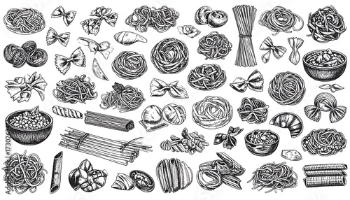pasta, noodle, food, italian, collection, variety, type, bow tie, spaghetti, fettuccine, penne, farfalle, rigatoni, fusilli, shell, dried, hand-drawn, vintage, illustration, graphic, design, black, white, vector