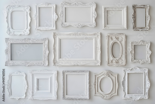 Collection of Various Vintage White Picture Frames on White Wall Mock up