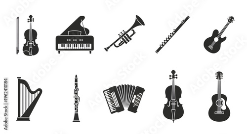 Collection of vector silhouettes featuring old town cityscapes and a diverse set of musical instruments and construction tools like hammers and brushes for design and repair