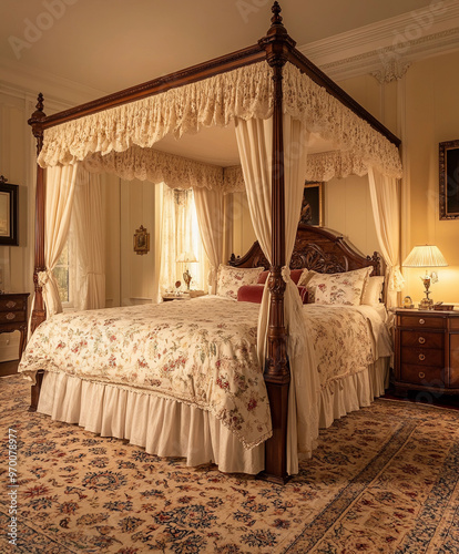 Colonial four-poster bed in an opulent historical bedroom, richly carved wooden posts, light cream-colored canopy with floral patterns