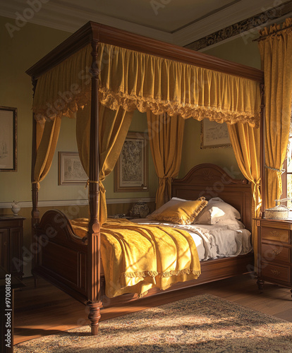 colonial four-poster bed with a golden yellow silk canopy, set in a classic bedroom with period furniture